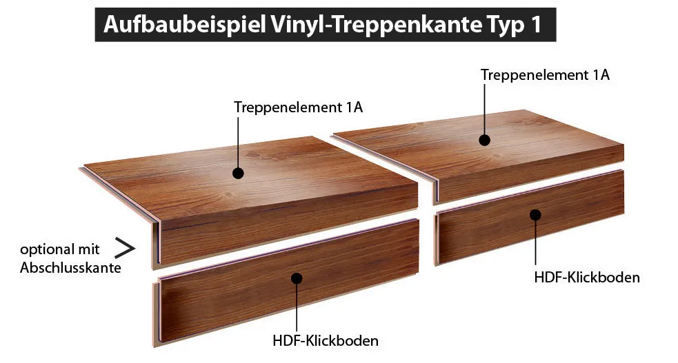 Unsere Vinyl-Treppenkanten sind eine clevere Lösung um Treppen zu gestalten, die in Design, Struktur und Farbe perfekt zu den jeweiligen Böden passen. Die Treppenkanten sind nämlich aus dem gleichen Material gefertigt wie unsere HDF-Vinylböden.
